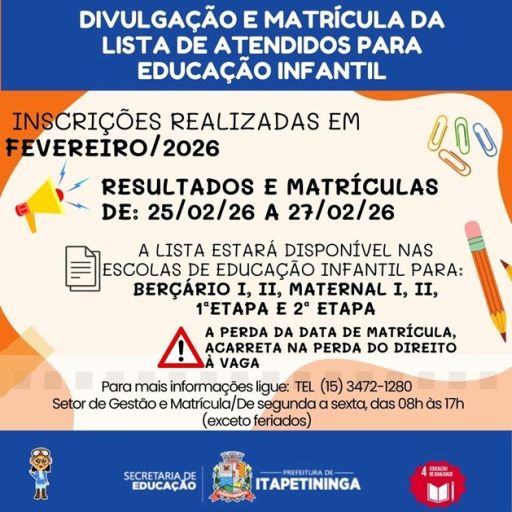 Está chegando o período de divulgação e matrícula para a Educação Infantil, referente às inscrições realizadas em fevereiro/2026. Preparem-se!