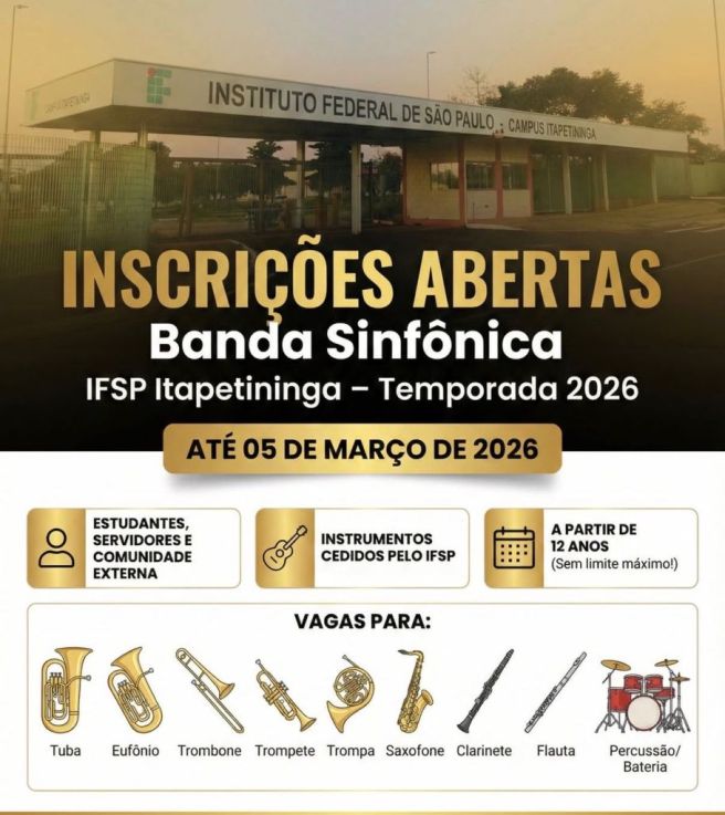 Estão abertas, até o dia 5 de março, as inscrições para participação na Banda Sinfônica do Instituto Federal de Educação, Ciência e Tecnologia de São Paulo – Campus Itapetininga, referente à temporada 2026.