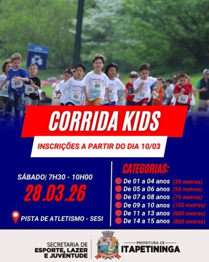 A Corrida Kids será realizada no dia 28 de março (sábado), na Pista de Atletismo do SESI, que fica à avenida Padre Antônio Brunetti, 1.360, na Vila Rio Branco. A concentração está marcada para às 7h30 com a entrega do número de peito dos atletas. O início das provas será às 8h. Serão seis categorias, por idades. Todos vão receber medalha.