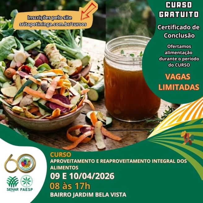 Outro curso oferecido é Aproveitamento e Reaproveitamento Integral dos Alimentos, que acontece nos dias 9 e 10 de abril, também das 8h às 17h, no Jardim Bela Vista. A formação ensina técnicas para utilizar integralmente os alimentos, evitando desperdícios e incentivando práticas sustentáveis na alimentação.