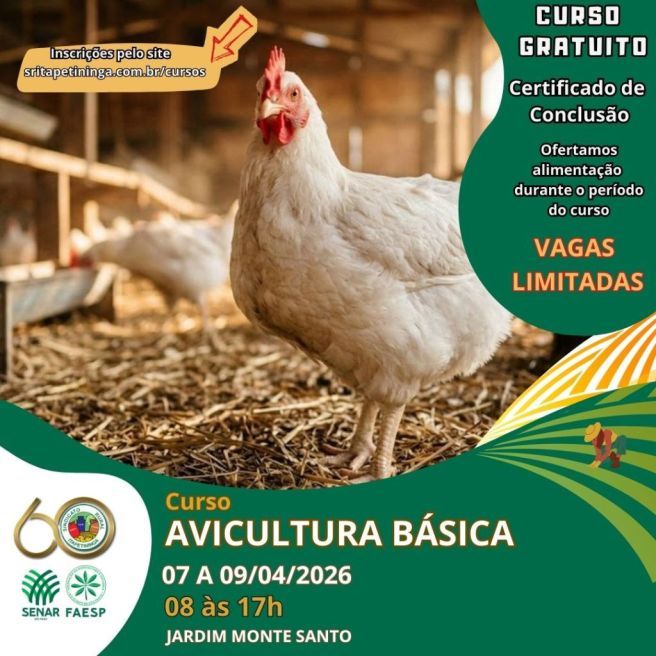 Entre os cursos disponíveis está Avicultura Básica, que será realizado de 7 a 9 de abril, das 8h às 17h, no Jardim Monte Santo. A capacitação abordará conceitos fundamentais da criação de aves, manejo, alimentação e boas práticas para quem deseja iniciar ou aprimorar atividades na área.
