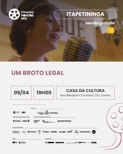 Abril chega com mais uma temporada de cinema na Casa da Cultura de Itapetininga. Sempre às quintas-feiras, às 19h, o público poderá assistir gratuitamente a uma programação especial de filmes por meio do Pontos MIS, oferecimento do Museu da Imagem e do Som e da Secretaria de Cultura, Economia e Indústrias Criativas do Estado de São Paulo.
