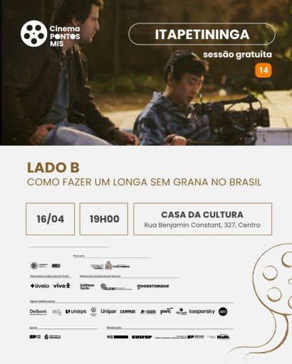 Em 16 de abril, também às 19h, o público poderá assistir ao documentário “Lado B: como fazer um longa sem grana no Brasil”, de Marcelo Galvão. Com classificação de 14 anos, o filme apresenta, com humor, os bastidores e desafios do cinema independente brasileiro, acompanhando os quatro anos de luta para viabilizar a produção do longa Quarta B.