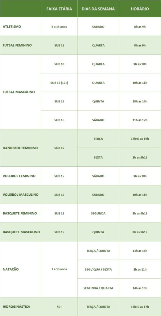 Confira abaixo as informações e detalhes sobre os dias de aula, horários e faixas etárias da modalidade de seu interesse: