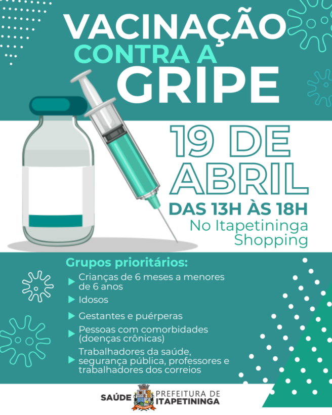 A Prefeitura de Itapetininga, por meio da Secretaria de Saúde, realiza neste sábado (19), no Itapetininga Shopping, das 13 às 18 horas, a vacinação contra a Gripe para ampliar a cobertura vacinal contra a doença no município.