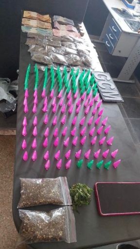 No interior dos objetos descartados foram encontrados 16 porções de maconha, 5 flores da mesma substância, 2 sementes, 128 pinos de cocaína, além de R$ 729,25 em dinheiro e um aparelho celular.