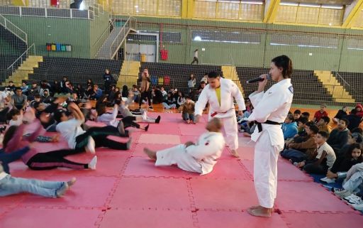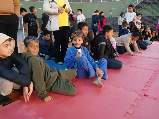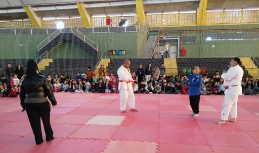 Durante o “aulão” com as crianças, Edinanci convidou Lucas Brisola de 10 anos, aluno da Escola Municipal “Prof. Francisco Fabiano Alves”, para uma demonstração da modalidade no tatame. Atleta e aluno mostraram técnica e habilidade.