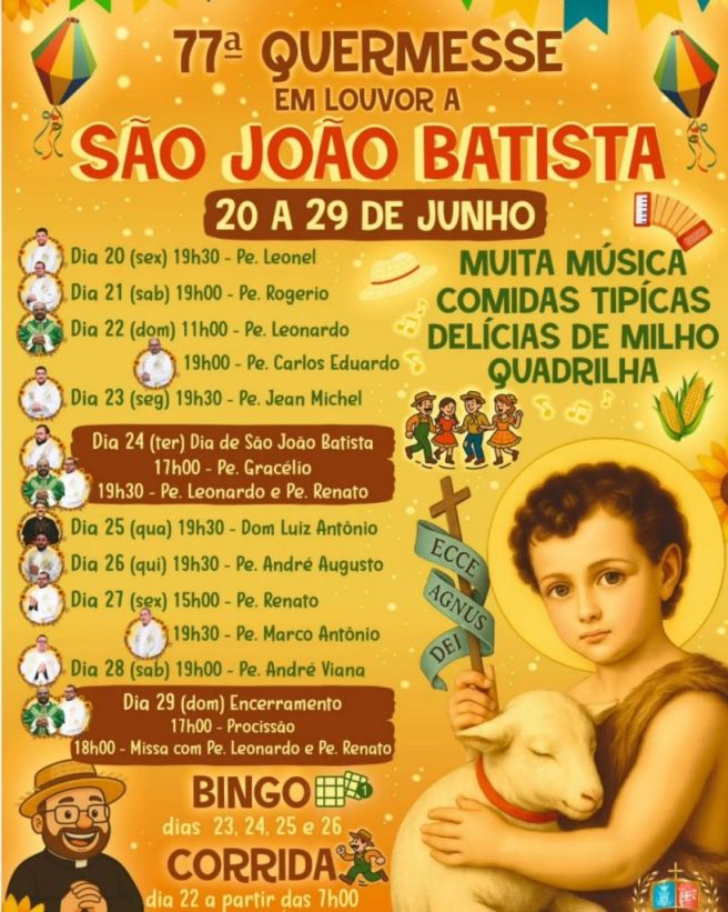 A tradicional Festa em Louvor a São João Batista chega à sua 77ª edição e promete reunir fé, cultura e alegria entre os dias 20 e 29 de junho. O evento será marcado por uma programação especial com música ao vivo, comidas típicas, delícias de milho, quadrilha e muita animação.