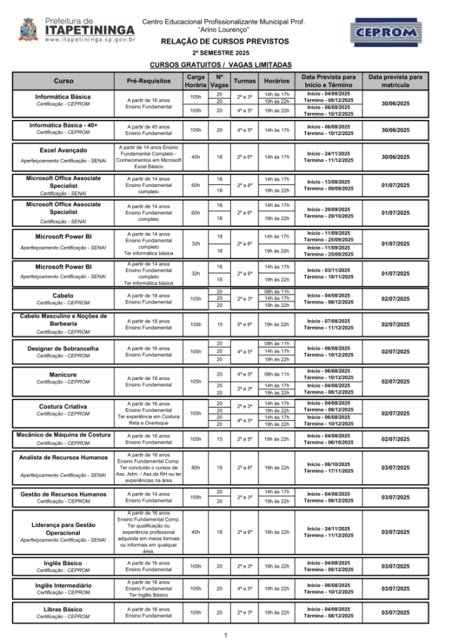 As matrículas para os cursos profissionalizantes do Ceprom, Centro Profissionalizante Municipal de Itapetininga, estarão abertas de 30 de junho a 07 de julho, com vagas limitadas e distribuídas por ordem de chegada. Ao todo, são 908 vagas distribuídas entre 28 diferentes cursos gratuitos.