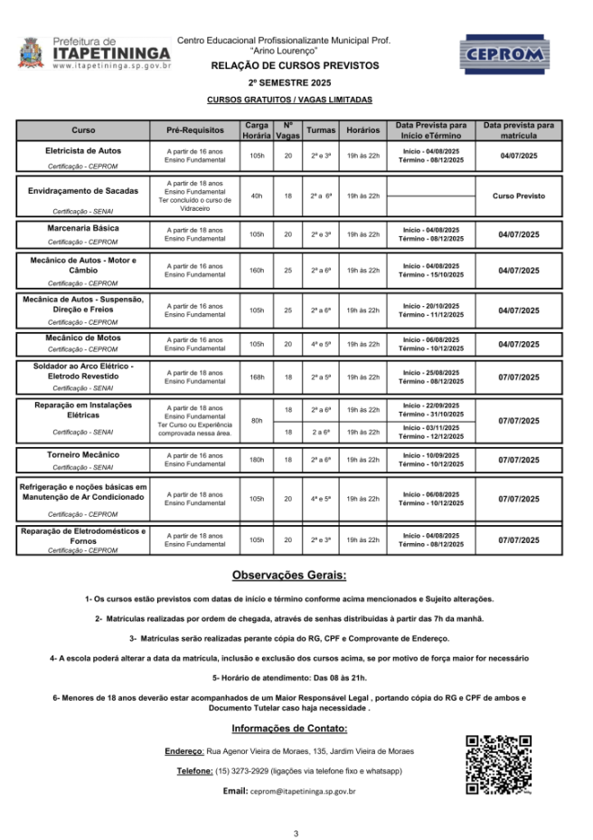 Cada curso terá um dia específico para matrícula. Por isso, é importante estar atento ao cronograma e chegar cedo. As senhas serão distribuídas às 7h, na portaria, e o atendimento terá início às 8h. Os cursos têm data prevista de início em 04 de agosto de 2025.