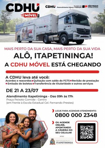 Em parceria com a Prefeitura de Itapetininga, a Companhia de Desenvolvimento Habitacional e Urbano (CDHU) traz à cidade o serviço CDHU Móvel, uma unidade itinerante que oferecerá atendimento direto aos mutuários da região entre os dias 21 e 23 de julho.