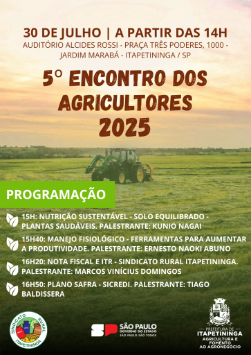 O 5º Encontro dos Agricultores reflete o compromisso da comunidade agrícola de Itapetininga e região com a busca constante por conhecimento e inovação, fundamentais para o crescimento sustentável do agronegócio. A participação é gratuita. A ação evidencia a relevância do segmento e fortalece ainda mais os laços entre os agricultores e a promoção do desenvolvimento rural.