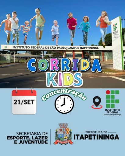 A Corrida Kids será realizada em parceria com o IFSP - Instituto Federal de Educação, Ciência e Tecnologia de São Paulo, no dia 21 de setembro (domingo), com concentração às 8h. O percurso será dentro do Campus do IFSP, que fica à avenida José Olímpio de Oliveira, 1561, Vila Asem, em Itapetininga. Todos os participantes recebem medalha.