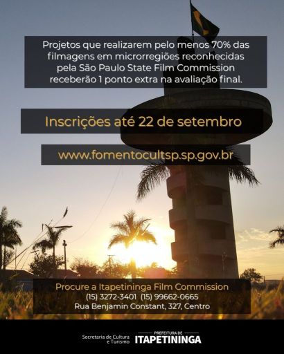 Uma das novidades deste edital é a pontuação adicional: projetos que realizarem pelo menos 70% das filmagens em microrregiões reconhecidas pela São Paulo State Film Commission receberão 1 ponto extra na avaliação final. Entre as cidades com esse reconhecimento está Itapetininga, destacada pelo seu patrimônio histórico, arquitetônico, natural e cultural, que oferece cenários únicos para produções audiovisuais.