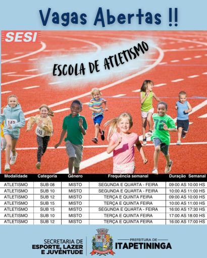 A Escola de Atletismo, uma parceria entre a Prefeitura, por meio da Secretaria de Esporte, Lazer e Juventude e o SESI (Serviço Social da Indústria), oferece vagas para meninos e meninas, em quatro categorias, com aulas gratuitas.