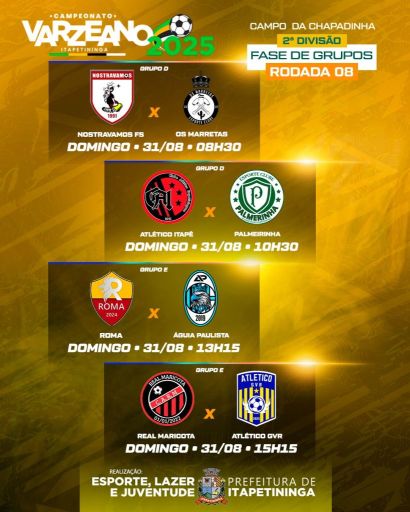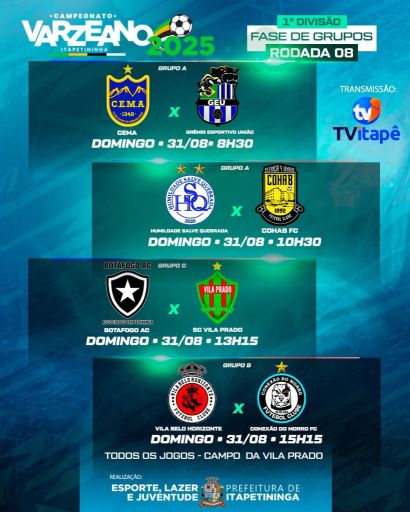 No próximo domingo, dia 31, o Campeonato Varzeano de Itapetininga traz oito partidas válidas pela 8ª rodada da competição. Os jogos serão realizados no Campo da Vila Prado e no Campo da Chapadinha.