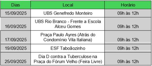 É importante destacar que todas as Unidades de Saúde de Itapetininga também estarão intensificando os testes de tuberculose nesse período. Caso apresente algum sintoma basta procurar o posto de saúde mais próximo da sua residência.