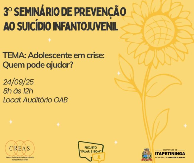 Com uma reflexão urgente sobre o papel da sociedade, da família, da escola e da tecnologia no cuidado com a saúde mental dos jovens, o 3º Seminário de Prevenção ao Suicídio Infantojuvenil faz parte das atividades da Prefeitura de Itapetininga em alusão ao “Setembro Amarelo”, campanha voltada à valorização da vida.
