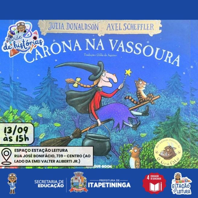 A primeira história é do livro: “Carona na Vassoura”, de Julia Donaldson e Axel Scheffler, com uma bruxa diferente, sempre contente e muito generosa.