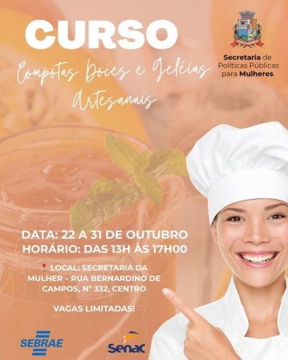 A Prefeitura de Itapetininga, por meio da Secretaria de Políticas Públicas para Mulheres, em parceria com o SEBRAE/SENAC, abre inscrições para o curso Preparo e Venda de Compotas e Geleias Artesanais.