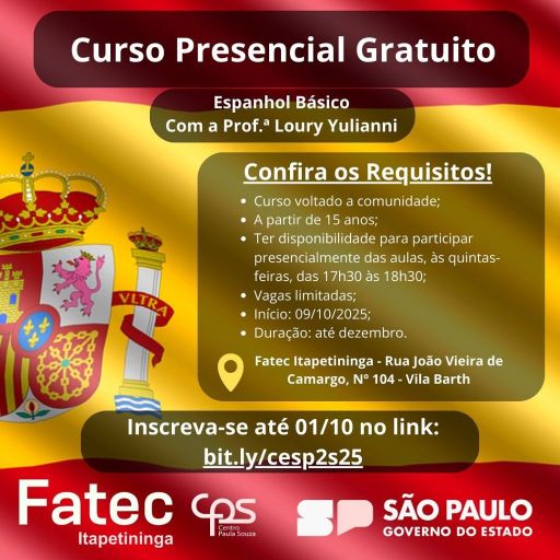 A Fatec Itapetininga abre mais uma oportunidade de aprendizado gratuito para a comunidade! A instituição está oferecendo o curso presencial de espanhol básico. A iniciativa busca ampliar o acesso ao ensino de idiomas e oferecer novas possibilidades de formação cultural e profissional para jovens e adultos.