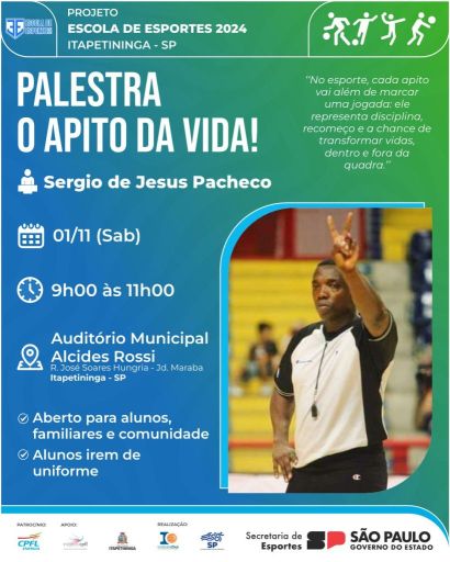 No próximo dia 1º de novembro (sábado), Itapetininga recebe o ex-jogador de basquete e árbitro internacional da modalidade Sergio de Jesus Pacheco para a palestra “O Apito da Vida”, que será realizada no Auditório Municipal “Alcides Rossi”, localizado anexo ao Paço Municipal, na Praça dos Três Poderes, no Jardim Marabá, das 9h às 11h.