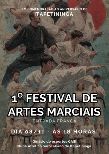 O 1º Festival de Artes Marciais de Itapetininga, promovido pela Prefeitura de Itapetininga, por meio da Secretaria de Esporte, Lazer e Juventude com apoio do CASI – Clube Atlético Sorocabana de Itapetininga será realizado no próximo sábado, dia 08 de novembro, a partir das 18h, no Ginásio do CASI que fica à rua padre Albuquerque, 1854, centro. A entrada gratuita.