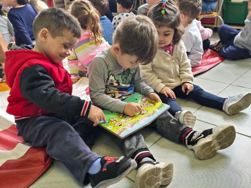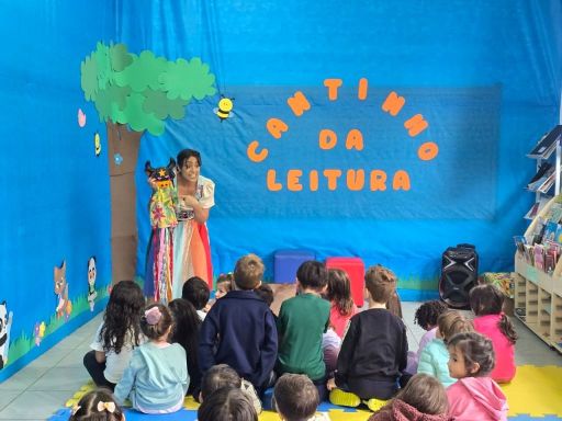 Crianças do Berçário à 1ª Etapa da Educação Infantil viveram uma tarde repleta de imaginação, encantamento e cultura, aproximando-se do universo do teatro e da tradição oral por meio da contação de histórias.