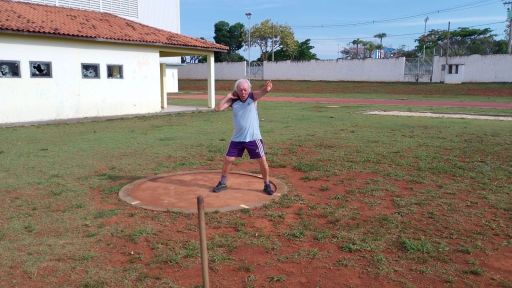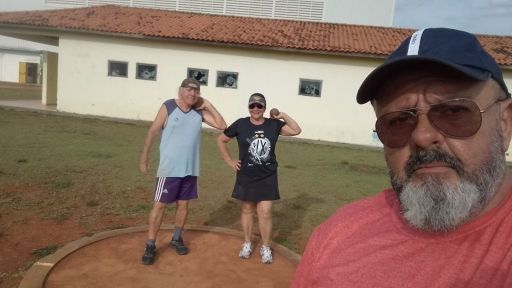 No CIE – Centro de Iniciação ao Esporte - “Estação Cidadania”, Benedito Proença, de 74 anos, e Sara Oliveira Miranda, de 65, aperfeiçoam o treinamento em Arremesso de Peso. As aulas são coordenadas pelo técnico e professor Fábio Monti, da Secretaria de Esporte, Lazer e Juventude.