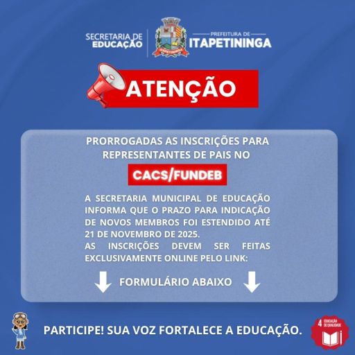 A Secretaria Municipal de Educação informa que o prazo para indicação de novos membros foi estendido até 21 de novembro de 2025.