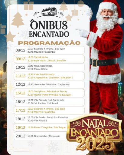 A população é convidada a acompanhar o trajeto e receber o Ônibus Encantado em sua região, celebrando o Natal com união, esperança e alegria.