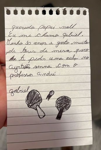 “Querido Papai Noel. Eu me chamo Gabriel. Tenho 10 anos e gosto muito de tênis de mesa. Quero te pedir uma aula no Ayrton Senna com o professor André. Gabriel”.