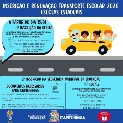 A Secretaria de Educação de Itapetininga informa que as inscrições para o transporte escolar da Rede Estadual estarão abertas a partir do dia 15 de janeiro. As vagas serão preenchidas conforme a disponibilidade ao longo do ano.