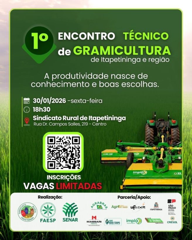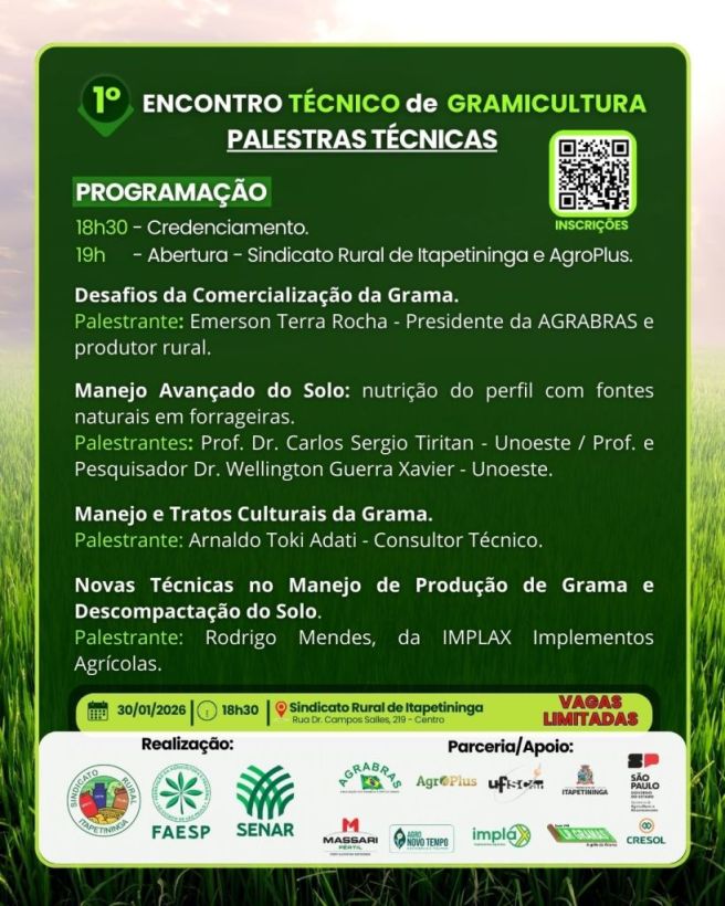 No dia 30 de janeiro, a partir das 18h30, será realizado o 1º Encontro Técnico de Gramicultura de Itapetininga e região, um evento imperdível que une conhecimento, inovação e boas práticas para aumentar a produtividade no campo. Uma oportunidade para trocar experiências, aprender com especialistas e fortalecer a gramicultura da região.