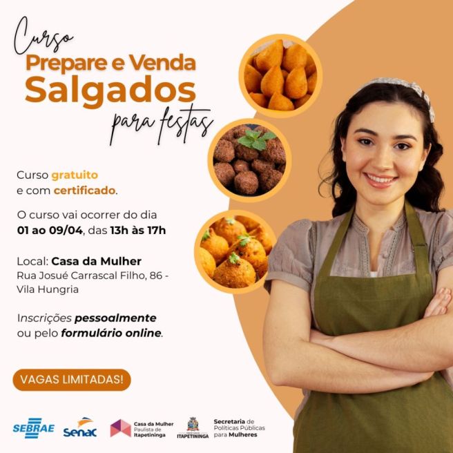 A Secretaria de Políticas Públicas para Mulheres de Itapetininga informa que as inscrições já estão abertas para o curso gratuito “Prepare e Venda Salgados para Festas”, promovido em parceria com o SEBRAE.