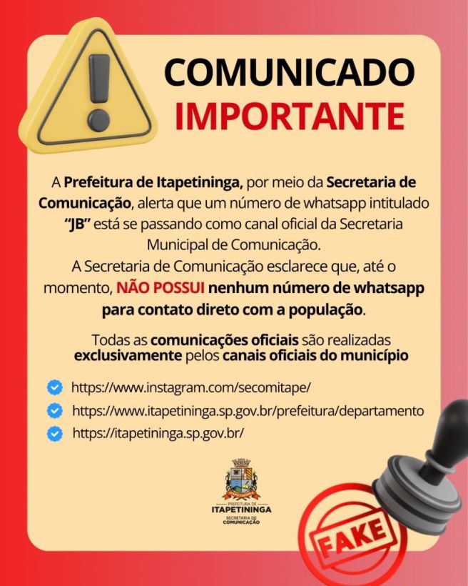 A Prefeitura de Itapetininga, por meio da Secretaria de Comunicação, alerta que um número de whatsapp intitulado “JB” está se passando como canal oficial da Secretaria Municipal de Comunicação.