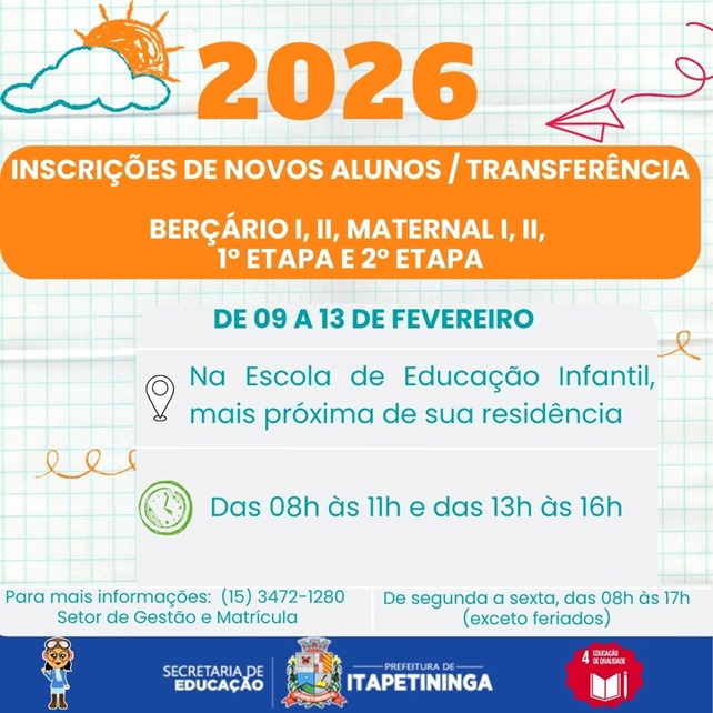 Vai começar o período de inscrições para a Educação Infantil 2026 (novos alunos e transferências). Não perca o prazo e garanta a vaga do seu pequeno!
