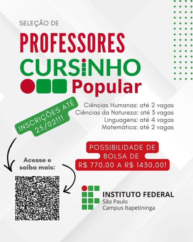 O Instituto Federal de São Paulo (IFSP) – Campus Itapetininga está com inscrições abertas para o Processo Seletivo de professores que irão atuar no Cursinho Popular 2026, iniciativa voltada à preparação de estudantes para vestibulares e para o Exame Nacional do Ensino Médio (Enem).