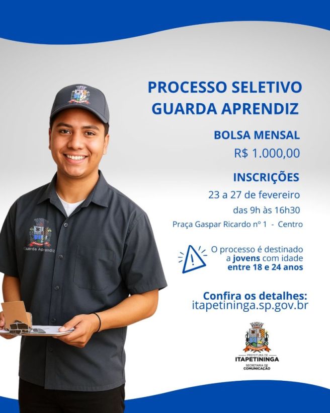 A Prefeitura de Itapetininga abre, entre os dias 23 e 27 de fevereiro de 2026, as inscrições para o Processo Seletivo Simplificado destinado à contratação temporária de Guarda Aprendiz, com 39 vagas disponíveis. A oportunidade é voltada a jovens de 18 a 24 anos, moradores do município, que atuarão junto ao estacionamento rotativo na área central. A jornada será de 30 horas semanais, com carga diária de 5 horas, de segunda-feira a sábado, e o selecionado receberá bolsa-auxílio no valor de R$ 1.000,00 por mês.