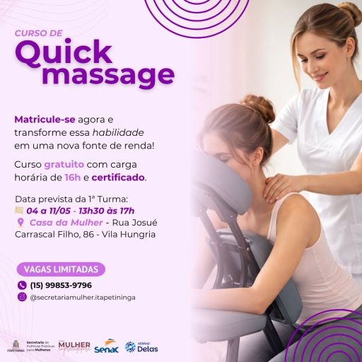 A Prefeitura de Itapetininga, por meio da Secretaria Municipal de Políticas Públicas para Mulheres, em parceria com o SEBRAE-SP, promoverá o curso gratuito “Aprenda Quick Massage”, com o objetivo de capacitar mulheres para atuação na área de bem-estar e geração de renda.