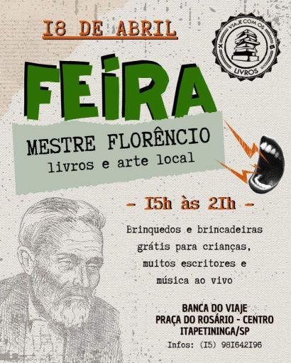 A Praça do Rosário, em Itapetininga, recebe, no sábado, dia 18 de abril, das 15h às 21h, a “Feira Mestre Florêncio", um evento gratuito e aberto ao público que celebra a cultura, a leitura e a produção artística local. A ação integra as comemorações pelo Dia Nacional do Livro Infantil.