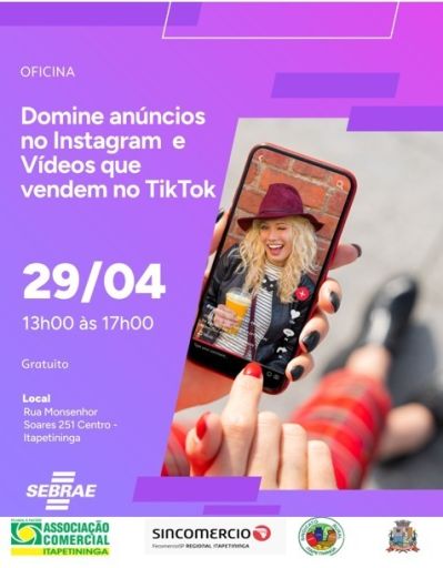 Acompanhando as tendências de marketing e a abrangência das redes sociais, a Prefeitura de Itapetininga, em uma parceria com o Sebrae, Sincomercio, Associação Comercial e Sindicato Rural, está com vagas abertas para a oficina gratuita e presencial “Domine anúncios no Instagram e Vídeos que vendem no Tik Tok”.