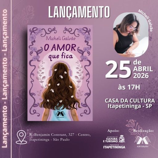 A escritora itapetiningana Micheli Galvão realiza, no próximo sábado (25), o lançamento de seu primeiro livro, “O Amor que Fica”, uma obra que propõe uma reflexão sensível sobre amadurecimento emocional, fé e processos de cura interior.