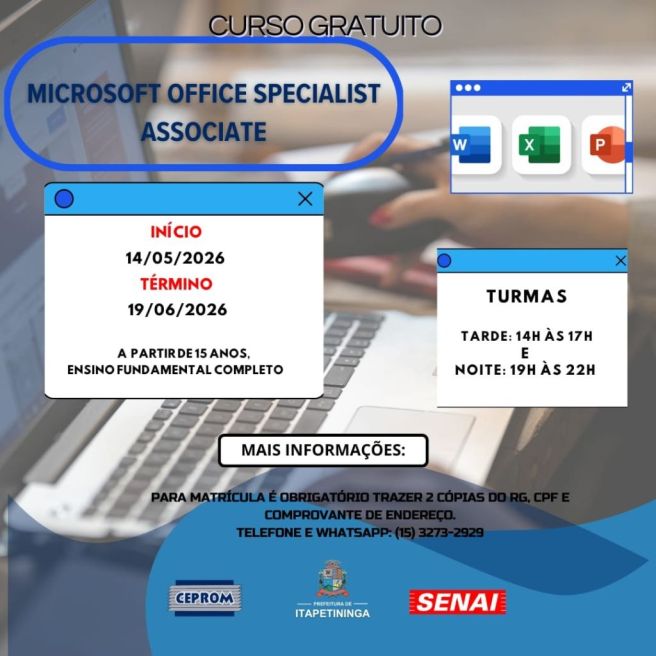Microsoft Office Specialist Associate - Aperfeiçoamento - 60h- 14/05/2026 à 19/06/2026 - 20 vagas - das 14:00 às 17:00 -