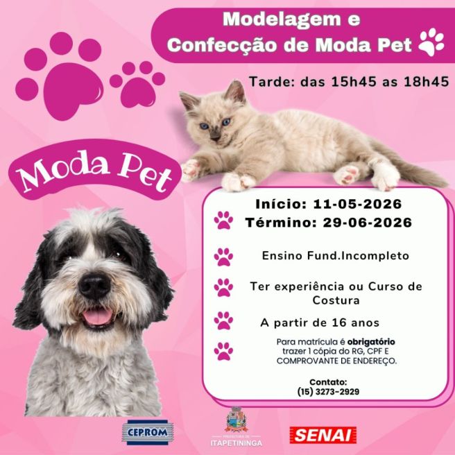 Modelagem e Confecção de Moda Pet - Aperfeiçoamento - 100h - 11/05/2026 à 29/06/2026 - 16 vagas - das 15:45 às 18:45