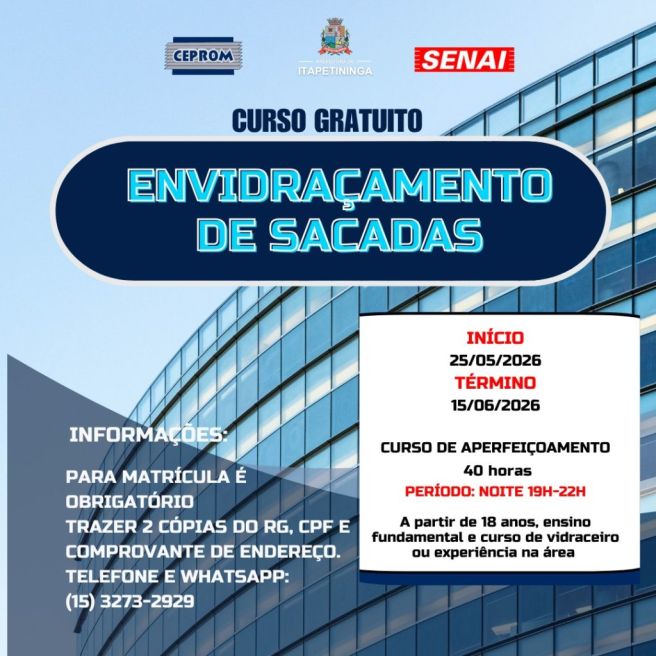 Envidraçamento de Sacadas - Aperfeiçoamento - 40h - 25/05/2026 à 15/06/2026 -16 vagas - das 19:00 às 22h:00 - Leite