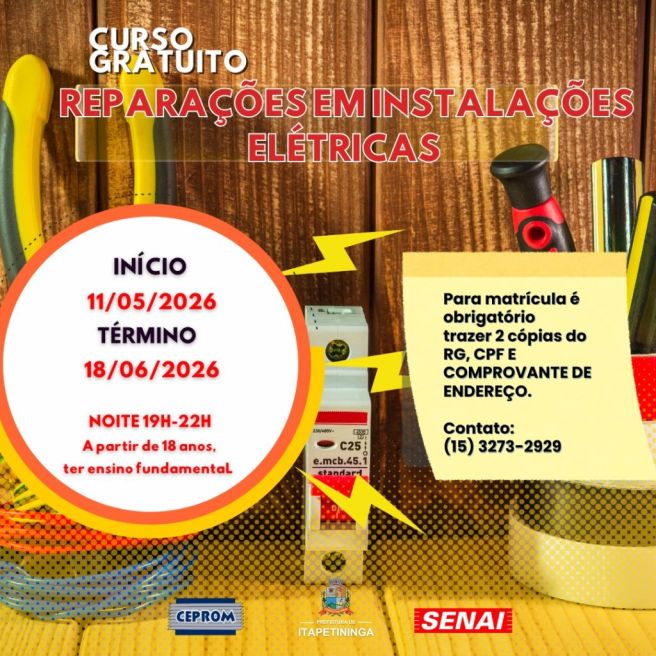 A Prefeitura de Itapetininga, por meio do Centro Educacional Profissionalizante Municipal - Ceprom – está com inscrições abertas para quatro novos cursos profissionalizantes, com 92 vagas ao todo, com certificação SENAI e Ceprom.