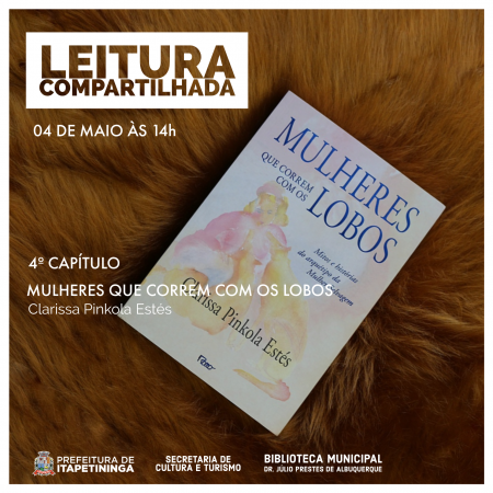Neste próximo sábado (4), o grupo da Leitura Compartilhada se reúne às 14h na Biblioteca Municipal “Dr. Júlio Prestes de Albuquerque”, para conversar sobre o quarto capítulo do livro “Mulheres que Correm com Lobos”, de Clarissa Pinkola Estés.