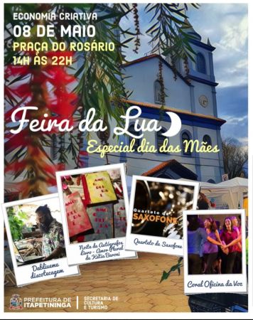 A Prefeitura de Itapetininga, por meio da Secretaria de Cultura e Turismo, promove nesta quarta-feira (8) mais uma edição da Feira da Lua, com uma programação especial dedicada ao Dia das Mães, data comemorada neste próximo domingo (12). Realizada quinzenalmente, a Feira tornou-se um sucesso no munícipio e, excepcionalmente nesta semana, tem seu horário estendido para oferecer o que há de melhor na economia criativa do município, das 14h às 22h, na praça do Rosário, na região central da cidade, e é aberto ao público.