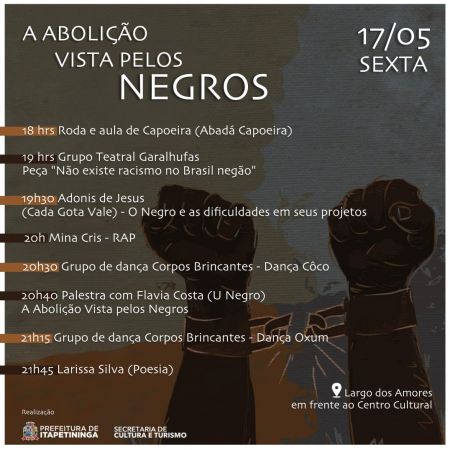 Nesta próxima sexta (17), terá a apresentação “A Abolição Vista Pelos Negros”, evento de visibilidade às vozes dos povos afrodescendentes, que discute a história social do negro no Brasil, a partir de visões apresentadas por agentes sociais e artistas de movimentos sociais.